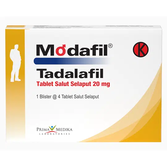 Modafil 20 mg 4 Tablet adalah obat yang mengandung Tadalafil. Tadalafil merupakan kandungan zat aktif yang termasuk golongan inhibitor PDE5. Obat ini digunakan untuk membantu mengatasi disfungsi ereksi pada pria, meredakan gejala pembesaran prostat jinak (benign prostatic hyperplasia/BPH), serta pada beberapa kasus digunakan dalam penanganan hipertensi arteri paru (PAH).