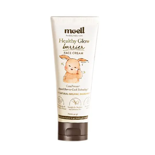 Moell Healthy Glow Barrier Face Cream 40 g adalah pelembap wajah yang diformulasikan secara khusus untuk merawat kulit bayi yang masih dalam tahap perkembangan, dan cenderung sensitif. Kulit bayi memiliki lapisan pelindung alami (skin barrier) yang lebih tipis dibandingkan kulit dewasa, sehingga lebih rentan kehilangan kelembapan dan mengalami kekeringan. Pelembap ini bertujuan untuk menutrisi serta mendukung fungsi skin barrier tersebut. Formulanya diperkaya dengan probiotik berbasis tumbuhan dan Panthenol yang bekerja untuk membantu menjaga ekosistem mikroorganisme baik pada kulit, menenangkan, dan mengunci kelembapan, sehingga kulit wajah bayi terasa lembap, lembut, dan tampak sehat.