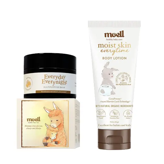 Moist Skin Everytime Body Lotion: Aplikasikan ke seluruh tubuh bayi dengan lembut. Moell Body Lotion dapat digunakan setiap pagi dan sore hari setelah mandi.