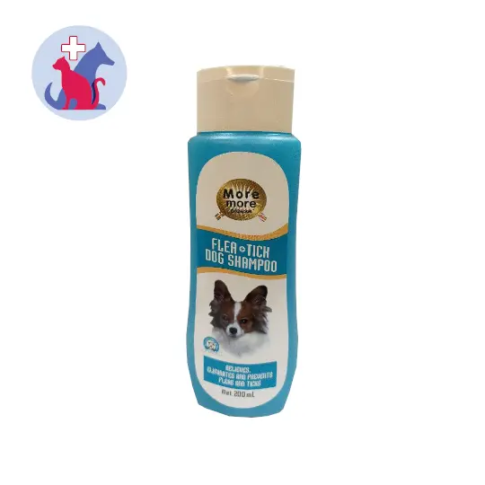 MORE MORE PLEASE FLEA & TICK DOG SHAMPOO merupakan shampoo khusus untuk anjing yang dibuat khusus untuk membasmi kutu pada badan anjing dan mencegah kutu datang kembali.
