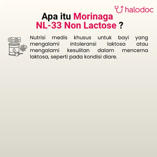 Morinaga NL-33 adalah susu formula bayi bebas laktosa untuk keperluan medis khusus bagi bayi usia 0-12 bulan yang mengalami masalah diare/ intoleransi laktosa/ galaktosemia. Diformulasikan dengan standar kualitas Morinaga Research Center Japan untuk membantu memenuhi kebutuhan nutrisi Si Kecil.