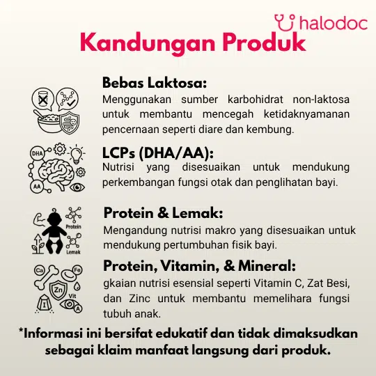 Dilengkapi Formula Bebas Laktosa dan Tinggi Zinc & Vitamin A. Mengandung nutrisi lengkap untuk Daya Tahan Tubuh, Tumbuh Kembang, dan Perkembangan otak anak dengan pencernaan sensitif.