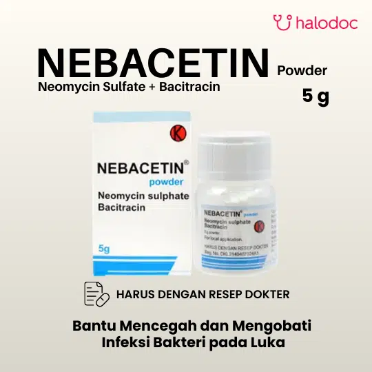 NEBACETIN POWDER adalah obat antibiotik topikal dalam bentuk serbuk tabur. Produk ini digunakan untuk mencegah dan mengobati infeksi kulit superfisial (permukaan) yang disebabkan oleh bakteri.