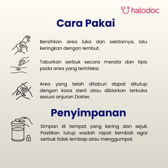 Bersihkan area kulit yang akan diobati, kemudian taburkan serbuk tipis-tipis. Area yang diobati dapat ditutup dengan kasa steril jika perlu.