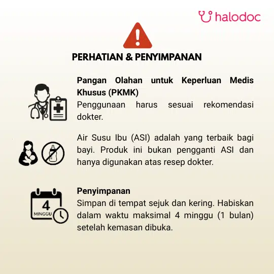 Produk ini merupakan pangan olahan untuk keperluan medis khusus berbahan dasar asam amino non- alergik untuk tata laksana diet bayi dengan alergi susu sapi dan intolerasi protein (Hipoalergenik). Penggunaan produk ini harus dengan rekomendasi dokter Hanya untuk penggunaan oral dan sonde tidak untuk penggunaan parenteral. Produk formula bayi ini buka produk steril, oleh karena itu perhatikan petunjuk penyiapan dan penyimpanan. Cara Penyimpanan: Simpan ditempat sejuk & kering. Setelah kaleng dibuka harus dihabiskan dalam waktu 1 bulan, lepaskan dan buang segel alumunium setelah kaleng dibuka. Produk ini harus disimpan dalam Kemasan Kedap Udara.