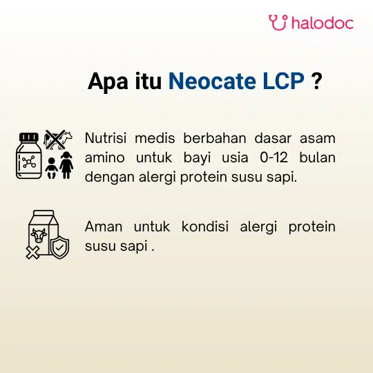 Neocate LCP adalah susu formula medis yang digunakan atas resep dokter, dirancang untuk memenuhi kebutuhan nutrisi bayi dengan alergi susu sapi berat dan intoleransi protein agar dapat mengejar tumbuh kembang secara optimal.