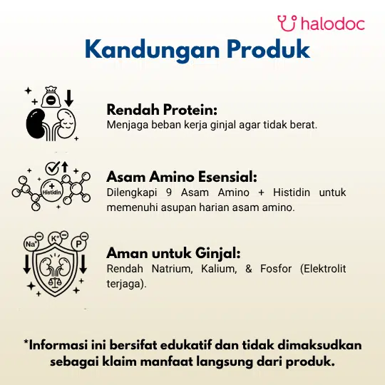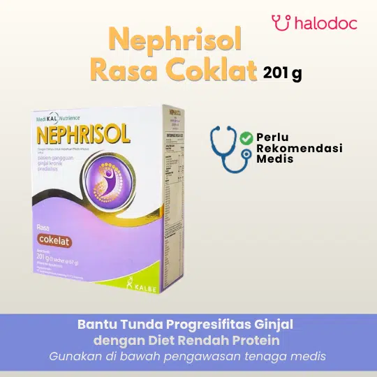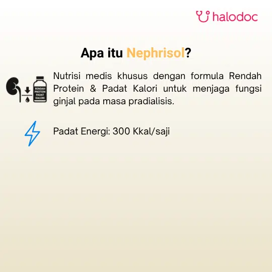 NEPHRISOL adalah pangan olahan untuk keperluan medis khusus yang diformulasikan untuk pasien dengan gangguan ginjal kronis pada tahap predialisis (belum menjalani cuci darah). Nutrisi ini dirancang untuk membantu memenuhi kebutuhan gizi sekaligus mengontrol asupan zat yang perlu dibatasi. Informasi Umum Terkait Kandungan*: *Informasi ini bersifat edukatif dan tidak dimaksudkan sebagai klaim manfaat langsung dari produk. Pada tahap predialisis, ginjal tidak dapat berfungsi optimal untuk menyaring produk sisa metabolisme protein (ureum). Oleh karena itu, pasien memerlukan diet rendah protein untuk mengurangi beban kerja ginjal. Nephrisol dirancang dengan kandungan Protein yang disesuaikan (rendah), namun terdiri dari asam amino esensial dan non-esensial untuk mencegah malnutrisi. Formula ini juga rendah natrium, kalium, dan fosfor untuk membantu mengontrol kondisi uremia dan komplikasi lainnya. Produk ini juga dilengkapi dengan vitamin dan mineral yang disesuaikan dengan kebutuhan khusus pasien ginjal, serta bebas laktosa.