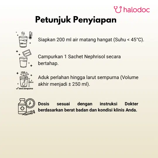 Untuk menyiapkan 1 sajian (250 ml), tuangkan 200 ml air matang hangat ke dalam gelas. Secara bertahap tambahkan 4 sendok takar (sekitar 61 g) bubuk Nephrisol sambil diaduk hingga larut.