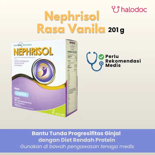 NEPHRISOL adalah pangan olahan untuk keperluan medis khusus yang diformulasikan untuk pasien dengan gangguan ginjal kronis pada tahap predialisis (belum menjalani cuci darah). Nutrisi ini dirancang untuk membantu memenuhi kebutuhan gizi sekaligus mengontrol asupan zat yang perlu dibatasi. Informasi Umum Terkait Kandungan*: *Informasi ini bersifat edukatif dan tidak dimaksudkan sebagai klaim manfaat langsung dari produk. Pada tahap predialisis, ginjal tidak dapat berfungsi optimal untuk menyaring produk sisa metabolisme protein (ureum). Oleh karena itu, pasien memerlukan diet rendah protein untuk mengurangi beban kerja ginjal. Nephrisol dirancang dengan kandungan Protein yang disesuaikan (rendah), namun terdiri dari asam amino esensial dan non-esensial untuk mencegah malnutrisi. Formula ini juga rendah natrium, kalium, dan fosfor untuk membantu mengontrol kondisi uremia dan komplikasi lainnya. Produk ini juga dilengkapi dengan vitamin dan mineral yang disesuaikan dengan kebutuhan khusus pasien ginjal, serta bebas laktosa.
