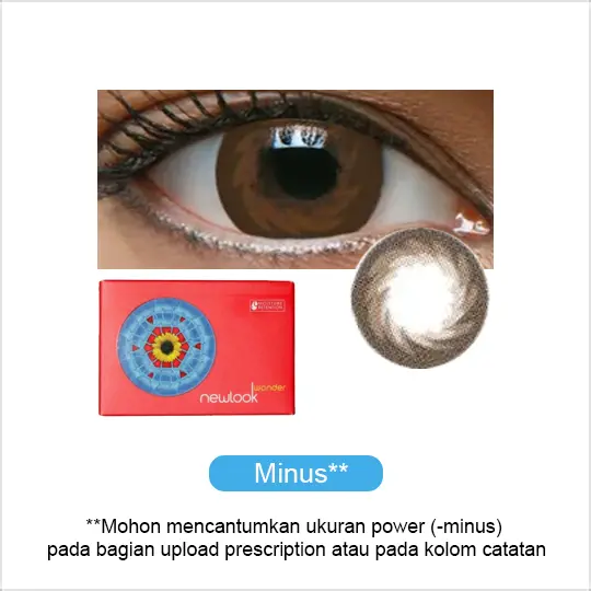 Softlens NEWLOOK WONDER untuk penggunaan 6 Bulan. Spesifikasi Produk: Base Curve: 8.6 mm Diameter: 14.2 mm Kadar Air/Water Content: 43% Masa Pakai/Recommended Usage: 3 Bulan/Monthly Warna/Color: Warna Brown Ukuran/Power Range: -0.5 s/d -4.75 (Step 0.25) -5.00 s/d -8.00 (Step 0.50) Isi/Content: 2 buah (1 pasang)