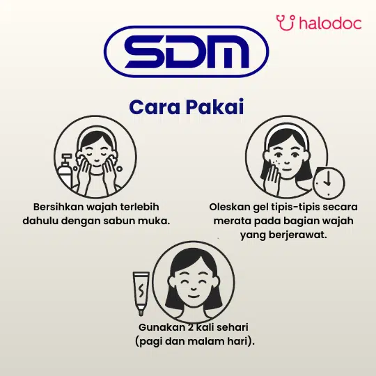 Oleskan gel secukupnya pada area wajah yang berjerawat setelah kulit dibersihkan dan dikeringkan.