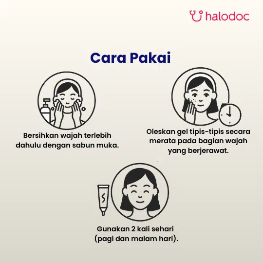 Oleskan gel secukupnya pada area wajah yang berjerawat setelah kulit dibersihkan dan dikeringkan.