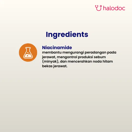 Jerawat yang meradang (inflammatory acne) terjadi karena respons peradangan tubuh terhadap bakteri dan sebum berlebih di dalam pori-pori. Produk ini mengandung Niacinamide (Nicotinamide) 4%, bentuk dari Vitamin B3, yang dikenal memiliki properti anti-inflamasi (anti-radang) yang kuat. Niacinamide bekerja dengan cara menstabilkan sel-sel imun dan menekan pelepasan mediator peradangan pada kulit. Hal ini secara langsung membantu menenangkan dan mengurangi gejala utama jerawat meradang seperti kemerahan, pembengkakan (papula), dan terbentuknya nanah (pustula). Selain itu, Niacinamide juga membantu memperkuat lapisan pelindung kulit (skin barrier), mengatur produksi sebum (minyak) berlebih, dan membantu menyamarkan noda bekas jerawat (post-inflammatory hyperpigmentation).