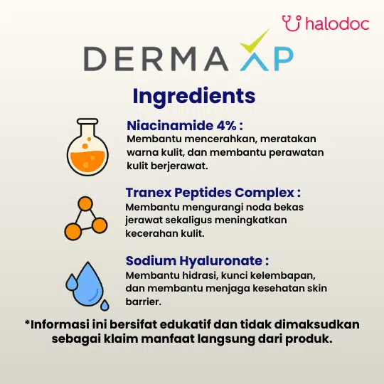 Produk ini memiliki 3X Aksi: Merawat Jerawat, Mencerahkan, dan Melembapkan. Formulanya mengandung Niacinamide 4% yang membantu menenangkan kulit kemerahan akibat jerawat dan mengatur produksi sebum. Tranex Peptides (kombinasi Tranexamic Acid dan Peptida) bekerja sinergis untuk membantu menyamarkan noda hitam bekas jerawat. Kandungan Sodium Hyaluronate memberikan kelembapan ekstra untuk menjaga lapisan pelindung kulit (skin barrier), sehingga kulit tampak lebih cerah dan sehat. Produk ini juga diformulasikan tanpa alkohol.