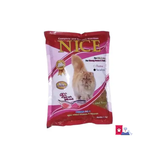 NICE SEAFOOD CAT DRY FOOD merupakan makanan khusus kucing dengan rasa seafood yang membantu memenuhi kebutuhan nutrisi harian untuk kucing kesayangan.