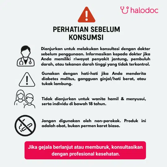 Tidak untuk digunakan oleh individu yang tidak merokok, anak di bawah 18 tahun, atau pasien dengan riwayat serangan jantung baru atau gangguan irama jantung serius.