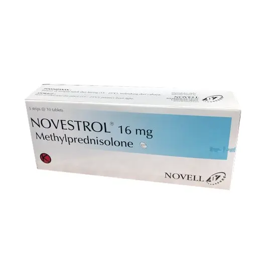 NOVESTROL 16 adalah obat yang mengandung Methylprednisolone, suatu glukokortikoid sintetik turunan prednisolon. Obat ini memiliki efek antiinflamasi dan imunosupresif yang poten. Mekanisme kerjanya melibatkan ikatan dengan reseptor glukokortikoid intraseluler, yang setelah teraktivasi akan berikatan dengan daerah promotor DNA. Proses ini memodulasi transkripsi gen, baik mengaktivasi maupun menekan ekspresi gen tertentu, termasuk melalui deasetilasi histon, sehingga mengakibatkan penurunan produksi mediator inflamasi. PREDNICORT secara klinis diindikasikan untuk penanganan berbagai kondisi alergi dan inflamasi yang memerlukan terapi glukokortikoid, seperti pada penyakit autoimun, gangguan pernapasan, serta kondisi dermatologis dan reumatologis. Dalam menggunakan obat ini HARUS SESUAI DENGAN PETUNJUK DOKTER. Pembelian obat ini memerlukan edukasi terkait penggunaan atau pengonsumsian obat yang tepat dan aman yang akan dikenakan biaya.