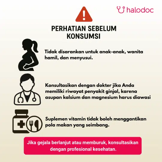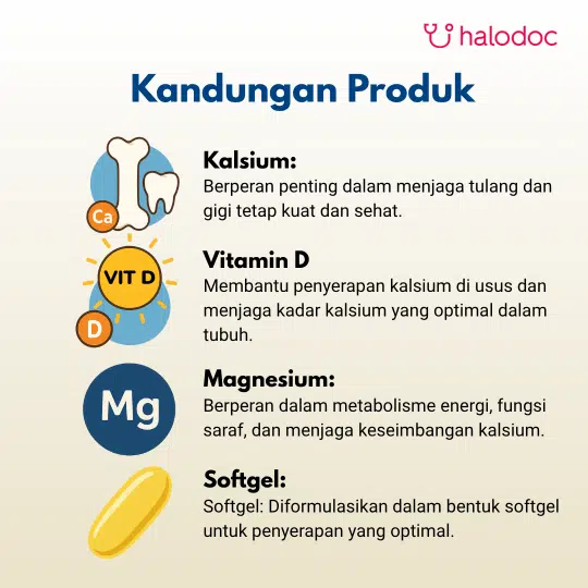 Tiap kapsul lunak mengandung: Kalsium, Magnesium, dan Vitamin D3.