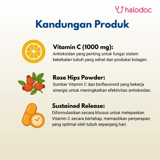 Produk ini mengandung Vitamin C (Ascorbic Acid) 1000 mg. Formula SR dirancang khusus untuk melepaskan Vitamin C secara perlahan dan bertahap selama beberapa jam. Mekanisme ini membantu menjaga kadar Vitamin C dalam tubuh tetap stabil dan memungkinkan penyerapan yang lebih optimal dibandingkan tablet biasa. Vitamin C adalah antioksidan kuat yang penting untuk fungsi sistem kekebalan tubuh. Produk ini juga diperkaya dengan Rose Hips, sumber alami Vitamin C dan bioflavonoid.