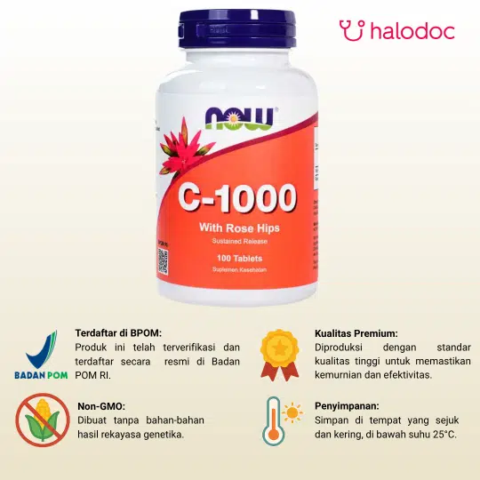 NOW VITAMIN C-1000 RH SR adalah suplemen kesehatan dengan Vitamin C dosis tinggi yang diformulasikan dalam bentuk tablet lepas lambat (Sustained Release/SR).