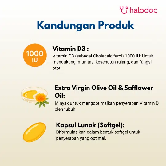 Produk ini mengandung Vitamin D3 (Cholecalciferol), bentuk vitamin D yang paling mudah diserap oleh tubuh. Vitamin D sangat penting untuk kesehatan tulang dan gigi karena berfungsi membantu penyerapan kalsium dan fosfor di usus. Selain itu, Vitamin D memainkan peran krusial dalam mendukung fungsi sistem kekebalan tubuh yang sehat. Dosis 1000 IU ditujukan untuk orang dewasa yang membutuhkan asupan Vitamin D harian yang cukup.