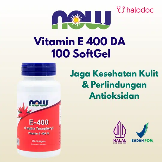 NOW VITAMIN E-400 adalah suplemen kesehatan yang mengandung Vitamin E alami (d-alpha) untuk membantu memelihara kesehatan kulit dan sebagai antioksidan.