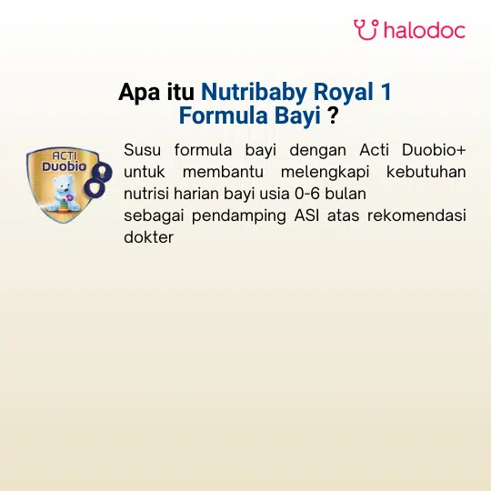 NUTRIBABY ROYAL 1 merupakan susu formula bayi bubuk untuk bayi usia 0-6 Bulan. Produk ini diperkaya dengan Galakto Oligosakarida (GOS), Frukto Oligosakarida (FOS), 16 Mineral, serta 17 vitamin yang dapat membantu melengkapi kebutuhan nutrisi bayi Anda.