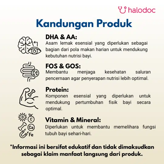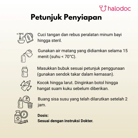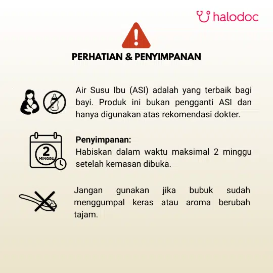 Gunakan sesuai saran dan petunjuk dokter atau ahli kesehatan lainnya untuk pemberian susu formula untuk bayi baru lahir. Pemberian Air Susu Ibu (ASI) (Susu bayi yang bagus) dianjurkan untuk diberikan secara eksklusif kepada bayi yang baru lahir hingga bayi berusia 6 (enam) bulan dan diteruskan hingga bayi berusia 2 (dua) tahun dengan makanan pendamping ASI (susu bayi terbaik) sesuai dengan kebutuhan tumbuh kembangnya. ASI (Susu terbaik untuk bayi) penting untuk dukung tumbuh kembang bayi 1-6 bulan.