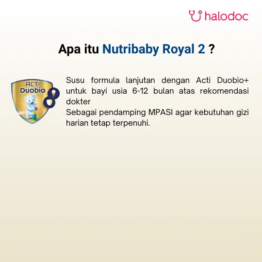 Nutribaby Royal 2 merupakan susu formula bayi bubuk lanjutan untuk bayi usia 6-12 Bulan. Produk ini diperkaya dengan Galakto Oligosakarida (GOS), Frukto Oligosakarida (FOS), 16 Mineral, serta 17 vitamin yang dapat membantu melengkapi kebutuhan nutrisi bayi Anda.