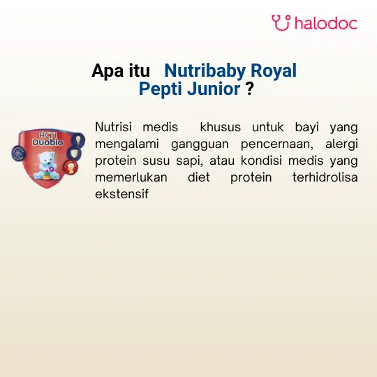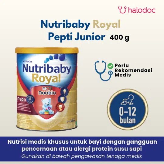 NUTRIBABY ROYAL PEPTI JUNIOR merupakan susu formula bayi untuk anak usia 0-12 bulan. Susu ini ditujukan untuk sindroma malabsorbsi dan alergi protein susu sapi. Susu ini mengandung Protein Terhidrolisat Ekstensif, bebas Laktosa, dan mengandung MCT (Trigliserida Rantai Sedang). Penggunaan susu ini harus dibawah pengawasan tenaga medis.