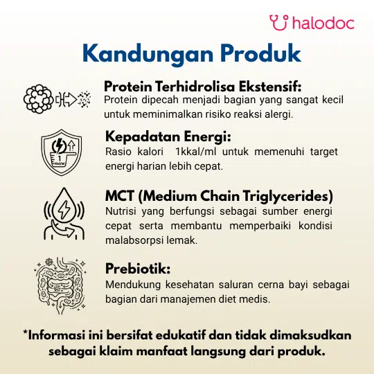 Produk ini merupakan formula untuk keperluan medis khusus untuk bayi usia 0-12 bulan dengan protein terhidrolistat ekstens.