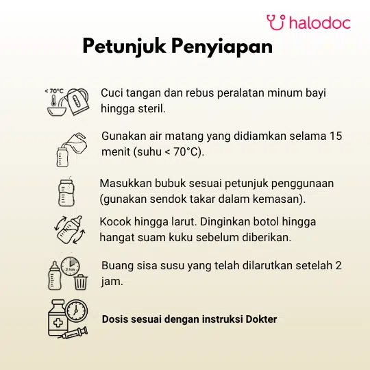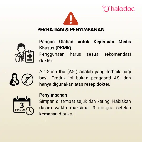 Simpan di tempat sejuk dan kering serta hindari dari sinar matahari. Gunakan dalam jangka waktu 2 minggu setelah kemasan dibuka. Jika Anda menemukan perubahan warna, bau, dan rasa pada produk ini, jangan dikonsumsi. Formula bayi bukan pengganti Air Susu Ibu (ASI). Penggunaan formula bayi hanya dapat dilakukan sesuai saran dan petunjuk dari dokter dan ahli kesehatan lainnya.