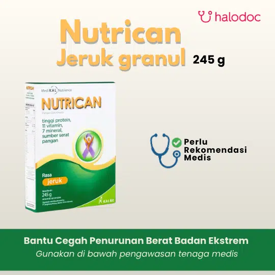 Nutrican Jeruk granul 245 g,merupakan olahan pangan medis khusus yang diformulasikan untuk menunjang kondisi pasien kanker yang cenderung kehilangan nafsu makan dan mengalami penurunan berat badan secara terus menerus.Penggunaan produk ini harus dengan rekomendasi dokter.