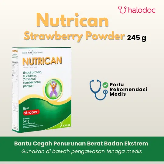Nutrican Strawberry Powder 245 g,merupakan olahan pangan medis khusus yang diformulasikan untuk menunjang kondisi pasien kanker yang cenderung kehilangan nafsu makan dan mengalami penurunan berat badan secara terus menerus.Penggunaan produk ini harus dengan rekomendasi dokter.