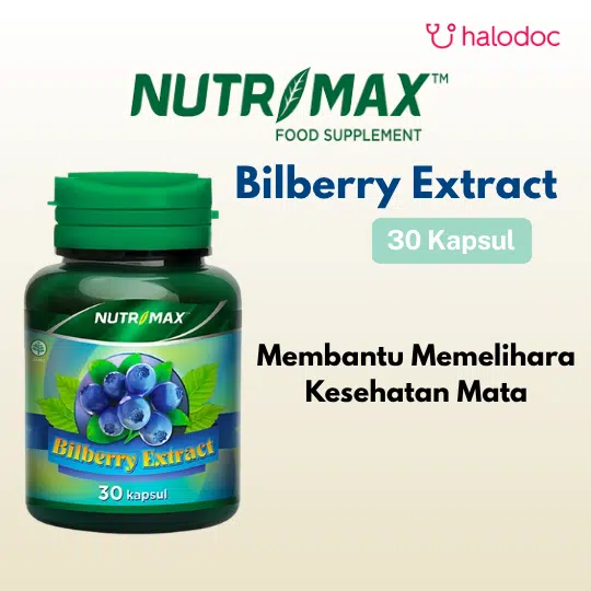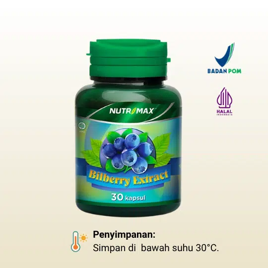 NUTRIMAX BILBERRY EXTRACT merupakan suplemen yang menggunakan Standardized ekstrak Bilberry, setara dengan 10.000 mg Bilberry powder dan mengandung minimal 25% anthocyanosides yang digunakan untuk membantu memelihara kesehatan mata dan melancarkan sirkulasi darah