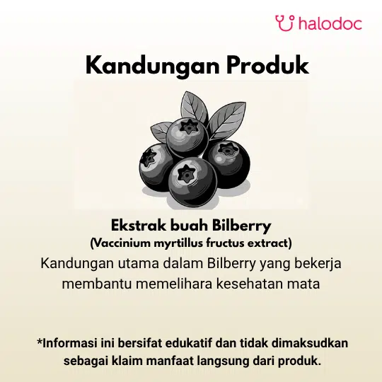 Tiap kapsul mengandung : Vaccinnium myrtillus fructus extract (Bilberry fructus extract) 110 mg.