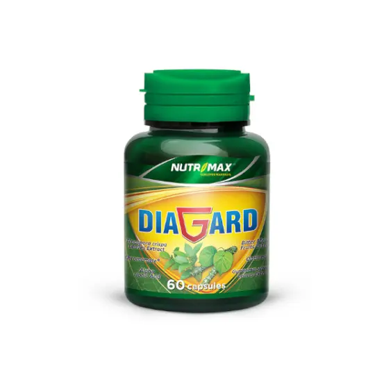NUTRIMAX DIAGARD mengkombinasikan herbal dan mineral penting yang bekerja secara lengkap untuk menormalkan gula darah. Suplemen ini mengandung Gymnema Sylvestre, Bitter melon, Tinospora crispa, Chromemate yang dikombinasikan dengan antioksidan Optizinc dan ALA. NUTRIMAX DIAGARD bekerja pada setiap tahap metabolisme gula dengan cara menghambat penyerapan gula di usus, meningkatkan produksi dan kerja insulin, meningkatkan sensitivitas reseptor insulin serta mencegah kerusakan pankreas, dan sebagai antioksidan untuk meningkatkan sensitifitas reseptor insulin.