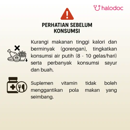 Untuk hasil optimal, kurangi makanan tinggi kalori dan berminyak (gorengan), tingkatkan konsumsi air putih (8 - 10 gelas/hari) serta perbanyak konsumsi sayur dan buah.