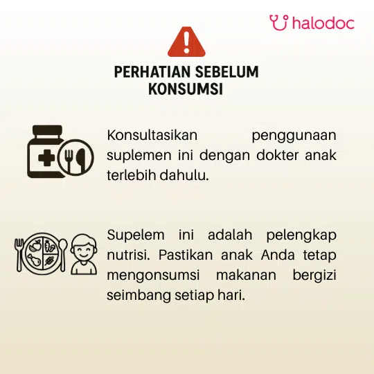 - Anak usia < 2 tahun : 1 tablet dapat dihaluskan dan dicampur dengan bubur/juice/susu