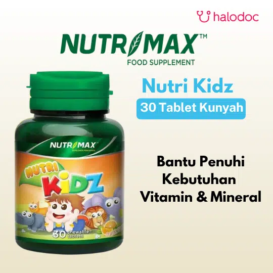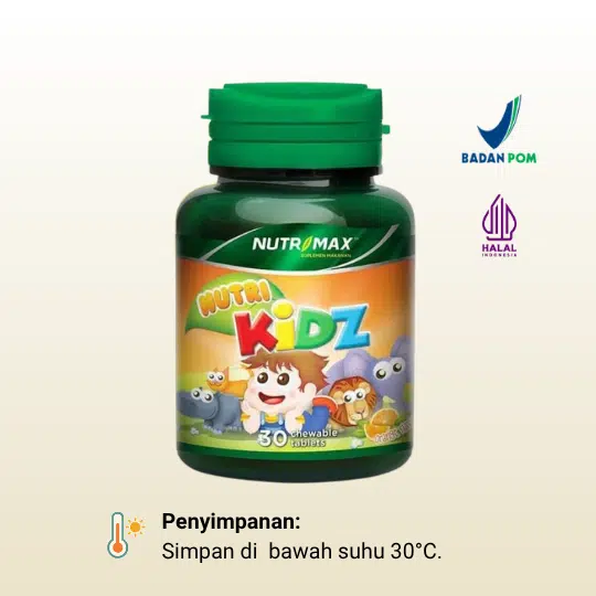 NUTRIMAX NUTRI KIDZ mengandung multivitamin dan mineral dengan komposisi lengkap diperkaya dengan L-Lysine untuk membantu meningkatkan nafsu makan anak dan juga dilengkapi dengan DHA (Docosahexaenoic acid) untuk mengoptimalkan perkembangan fungsi mental, otak dan mata serta meningkatkan konsentrasi belajar dan daya ingat. Tersedia dalam bentuk tablet kunyah (Chewable) dengan rasa jeruk yang sangat disukai oleh anak-anak.