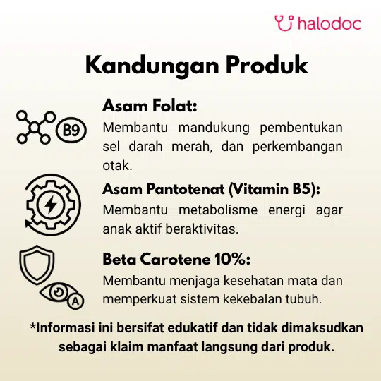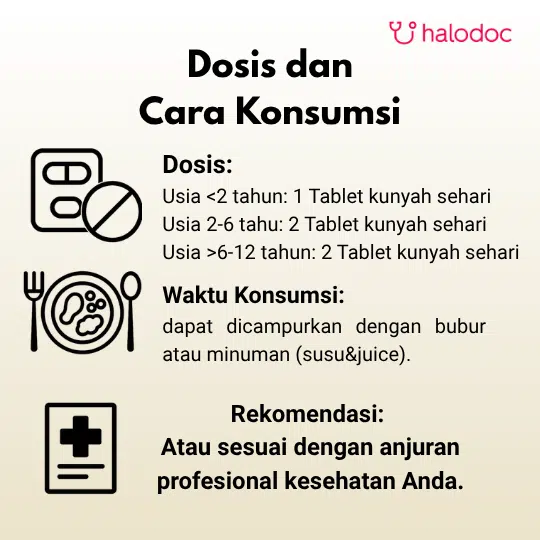 - Anak usia < 2 tahun : 1 tablet dapat dihaluskan dan dicampur dengan bubur/juice/susu