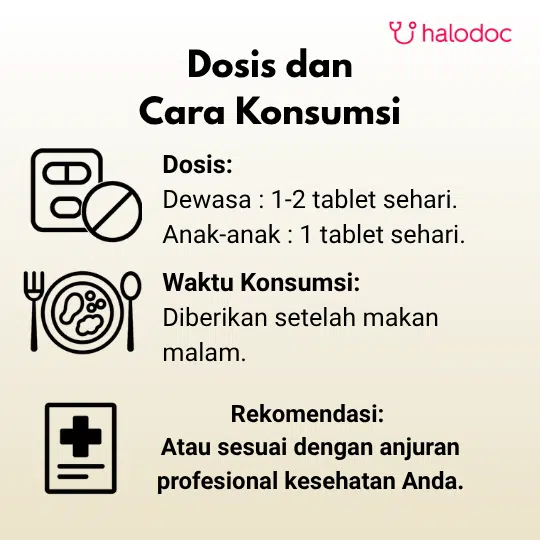 - Anak-anak : 1 tablet sehari setelah makan.