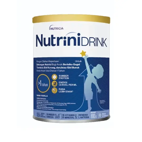 Produk ini merupakan pangan olahan keperluan medis khusus untuk dukungan nutrisi anak beresiko gagal tumbuh, gizi kurang dan/ atau gizi buruk. Pemakaian produk ini harus di bawah pengawasan Dokter ahli gizi atau praktisi medis. Tidak cocok untuk bayi dan pasien galaktosemia. Tidak disarankan untuk mengkonsumsi produk ini jika asupan energi sudah cukup. Untuk penggunaan lebih lanjut dengan dokter atau ahli gizi. PETUNJUK PENYIMPANAN: Simpan Nutrinidrink sediaan bubuk di tempat dingin dan kering (kurang dari 25 C). Jangan disimpan di lemari es. Nutrinidrink yang sudah dibuka harus disimpan dalam kemasan tertutup dan habiskan dalam waktu 1 (satu) bulan.