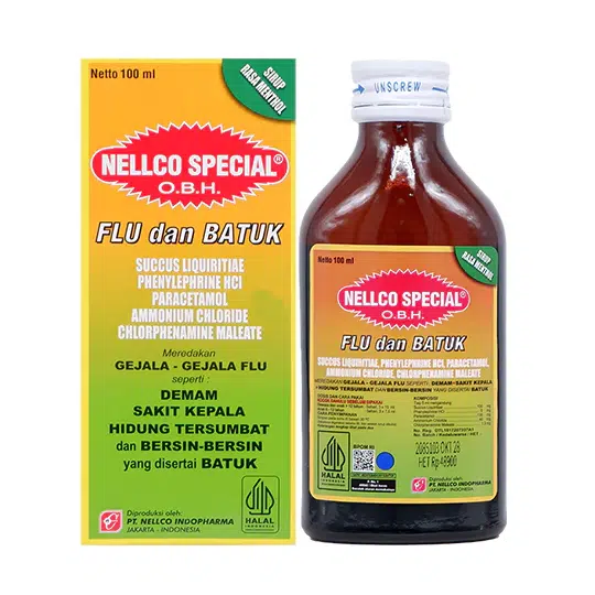 OBH Nellco Special PE/Flu dan Batuk Sirup 100 ml merupakan obat sirup yang mengandung Ammonium Chloride, Chlorphenamine Maleate, Glycyrrhizae Succus, Paracetamol, dan Phenylephrine HCl. Obat ini meringankan gejala flu seperti demam, sakit kepala, hidung tersumbat, dan bersin-bersin yang disertai batuk.