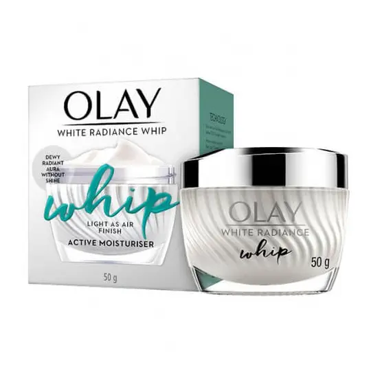 Olay White Radiance Whip Active Moisturiser merupakan krim pencerah yang diperkaya dengan dengan Teknologi Pearl- Optics (Inositol, Vitamin B3). Mudah meresap. Membantu mengurangi tersumbatnya pori-pori. Membantu mengurangi minyak berlebih dan memberikan hasil akhir matte bahkan setelah 8 jam. Membantu melembapkan dan menyiapkan kulit untuk pemakaian make-up sepanjang hari