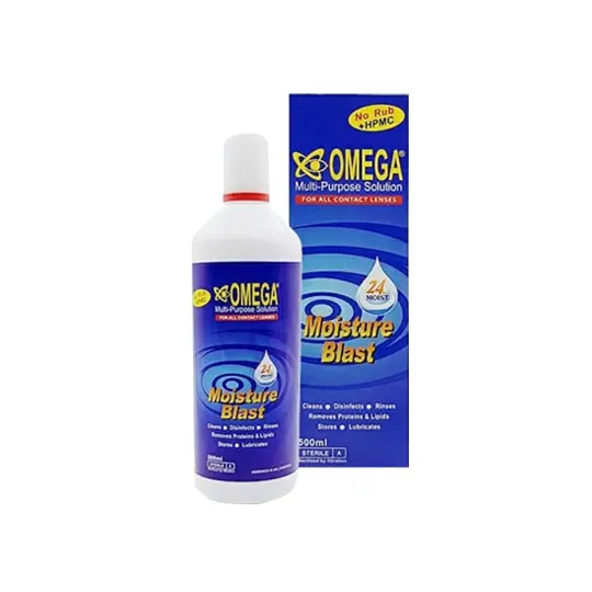 OMEGA MOISTURE BLAST merupakan cairan pembersih softlens yang dapat memberikan kelembaban sepanjang hari dan dapat digunakan sebagai cairan bilasan serta pembersih lensa kontak.