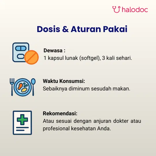 1 kapsul, diminum 3 kali per hari. Baik dikonsumsi oleh dewasa usia lebih dari 18 tahun hingga usia lanjut.