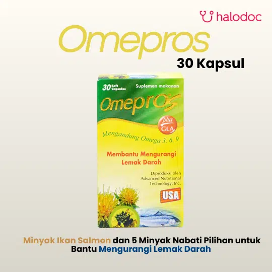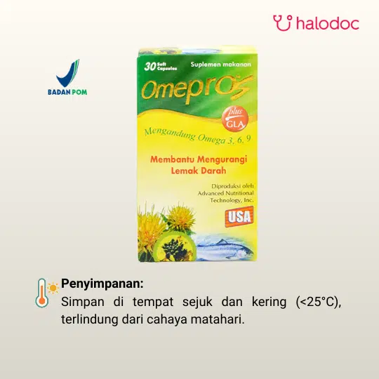 OMEPROS 30 KAPSUL merupakan suplemen makanan dengan kandungan omega 3, omega 6, omega 9, DHA, EPA, dan vitamin E yang membantu mengurangi lemak darah. Omega 3 merupakan asam lemak esensial atau asam lemak tak jenuh yang bekerja dengan membantu menurunkan kadar trigliserida dan meningkatkan kolesterol baik (HDL) di dalam tubuh sehingga membantu mencegah terjadinya penyumbatan di pembuluh darah akibat penumpukan kolesterol.