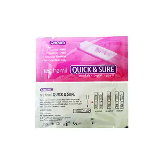 ONEMED QUICK & SURE STRIP adalah alat uji kehamilan yang sangat mudah digunakan dan mempunyai keunggulan teknologi dengan ketepatan seperti tes di laboratorium. Alat ini cepat dan tepat untuk mengetahui hasil kehamilan. Untuk mendapatkan hasil yang akurat sebaiknya digunakan setelah 7 hari berhubungan. Strip ini bekerja dengan cara mendeteksi tingkat kadar hormon hCG (human Chorionic Gonadotrophin) pada air seni, dimana hormon hCG akan meningkat pada saat awal kehamilan.