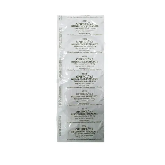 Opiprol 2.5 mg adalah sediaan obat yang mengandung zat aktif Bisoprolol Fumarate. Sebagai agen beta-blocker selektif, obat ini bekerja dengan memblokir reseptor beta-1 adrenergik pada jantung, sehingga menurunkan denyut jantung dan curah jantung. Mekanisme ini efektif dalam menurunkan tekanan darah dan mengurangi beban kerja jantung. Dalam menggunakan obat ini HARUS SESUAI DENGAN PETUNJUK DOKTER. Pembelian obat ini memerlukan edukasi terkait penggunaan atau pengonsumsian obat yang tepat dan aman yang akan dikenakan biaya.